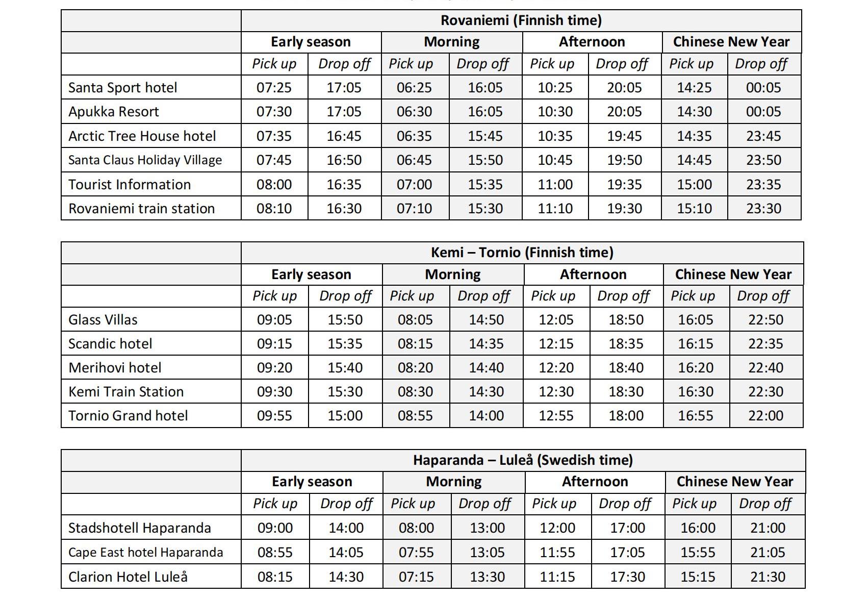 You can make a choice about Pick up and Drop off cities : Rovaniemi / Kemi / Tornio/ Haparanda / Luleå